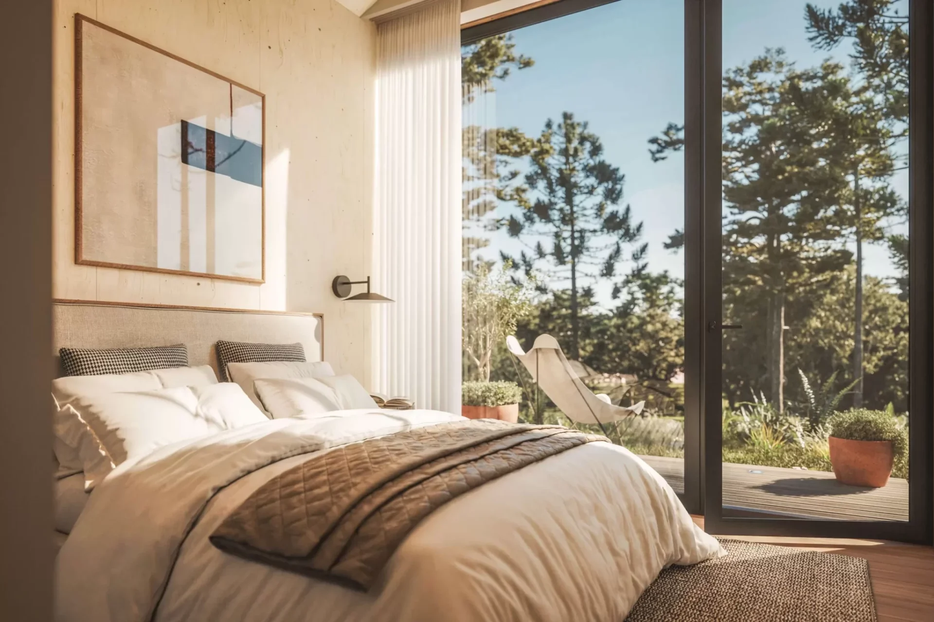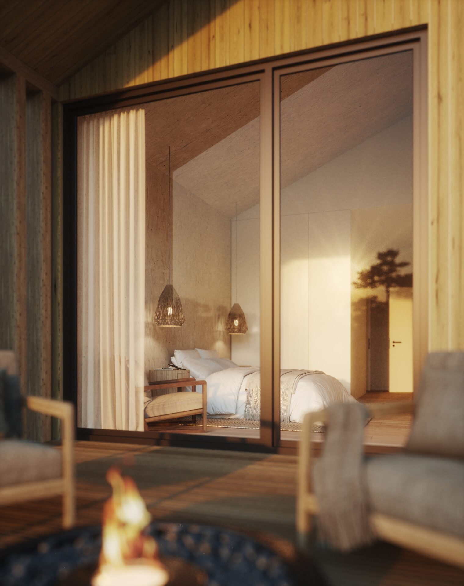 Naturalne drewno, miękkie światło i minimalistyczny design tworzą atmosferę ciepła i spokoju. To idealne miejsce, by zwolnić tempo i odnaleźć równowagę w otoczeniu natury. Każdy bungalow oferuje prywatne miejsce parkingowe oraz dostęp do wszystkich udogodnień ekologicznego resortu.